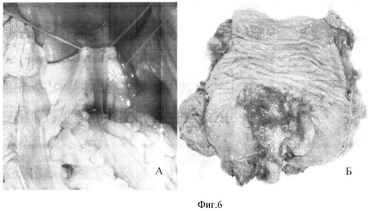 Фиг.6 – фиксация лоскута к поверхности тазовой брюшины (А); макропрепарат кишки с опухолью нижнеампулярного отдела с распространением на анальный канал (Б).