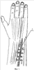 Сущность способа пластики кисти тыльным островковым кожно-жировым лоскутом предплечья с ретроградным кровотоком поясняется чертежами, где на фиг.1 представлен доступ к сосудистой ножке; на фиг.2 – выделение осевых островкового и мышечного лоскутов на сосудистой ножке; на фиг.3 – перемещение островкового лоскута на тыл кисти и закрытие сосудистой ножки мышечным лоскутом.