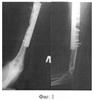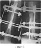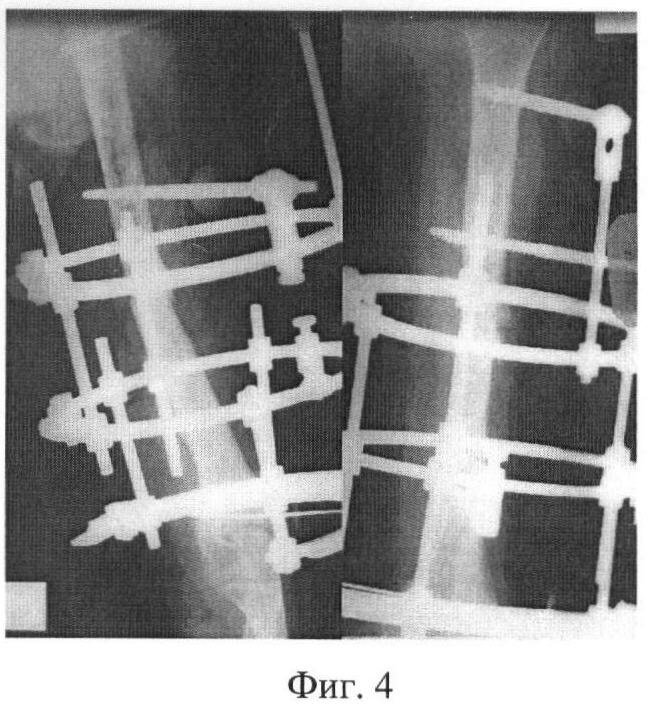 25.04.07 г. в СарНИИТО произведена операция: удаление пластины, замещение кортикального дефекта аутотрансплантатом (фиг.2), комбинированный чрескостный остеосинтез плеча (фиг.3) по предлагаемой методике. Рана зажила первичным натяжением. В послеоперационном периоде наблюдалось воспаление мягких тканей вокруг проксимального стержня, который был удален. После недельного консервативного лечения 16.08.07 г. ввели дополнительный стержень на этом же уровне. 23.10.07 г. демонтаж АВФ. После клинико-рентгенологического сращения (фиг.4) аппарат внешней фиксации 23.10.07 г. был демонтирован. Общий срок фиксации составил 6 месяцев.