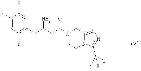 Другие ингибиторы DPP-IV описаны в заявке РСТ WO 03/004498 в примерах 1-33. В еще одном варианте осуществления настоящего изобретения предлагается соединение формулы (V), пример 7, известное под названием МК-0431.