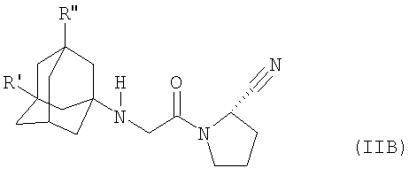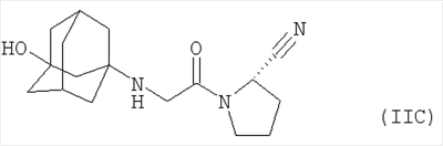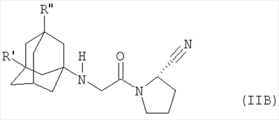 Прежде всего, соединения формулы (II), (IIA) или (IIB), пригодные для применения, включают (S)-1-[(3-гидрокси-1-адамантил)амино]ацетил-2-цианопирролидин формулы (в настоящем описании «соединение IIC»)