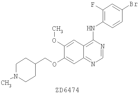 ZD6474 подпадает под широкое общее описание WO 98/13354 и проиллюстрирован примерами в WO 01/32651 (Пример 2). ZD6474 является мощным ингибитором VEGF RTK, а также обладает некоторой активностью к EGF RTK. Показано, что ZD6474 проявляет широкий спектр противоопухолевой активности на ряде моделей после перорального приема раз в сутки (Wedge S.R., Ogilvie D.J., Dukes M. и др., Proc. Am. Assoc. Cane. Res. 2001; 42: abstract 3126).