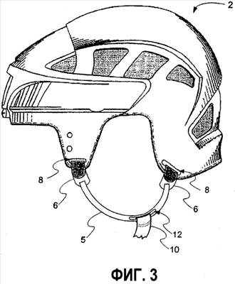 Со ссылкой на фиг.1 показан спортивный шлем 2 предшествующего уровня техники, имеющий ушную петлю 4 и подбородочный ремешок 10 (показан не полностью). Ушная петля 4 соединена со шлемом 2, используя соединительные элементы 6, проходящие через соответствующие прорези 8 шлема. Как вариант, также могут быть использованы различные другие соединительные элементы или способы соединения, известные специалистам в данной области техники. В заключение, подбородочный ремешок 10 соединен с ушной петлей 4 посредством оборачивания его конца вокруг подбородочного ремешка 10 и пришиванием его к самому себе. Как вариант, подбородочный ремешок может быть присоединен к самому себе, используя кнопку, липучку или любые иные подобные средства. Фиг.2 показывает увеличенный вид соединения подбородочного ремешка 10 с ушной петлей 4. Как видно на фиг.2, подбородочный ремешок 10 может свободно перемещаться по ушной петле 4 по траектории 11 и, например, перемещаться вверх в положение 10а, которое, в свою очередь, перемещает положение подбородочного ремешка 10 вдоль и под челюстью и подбородком пользователя (не показан).