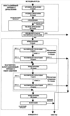 1. Способ обогащения гематитовых руд, включающий постадийный процесс дробления и магнитно-флотационный процесс обогащения, включающий три стадии измельчения, магнитные сепарации первой и второй стадий соответственно после первой и второй стадий измельчения, флотацию магнитного продукта второй стадии магнитной сепарации после третьей стадии его измельчения, при этом каждую стадию магнитной сепарации проводят в два приема последовательно и сепарацию второго приема осуществляют в сильном поле, отличающийся тем, что после постадийного процесса дробления на сепараторах, магнитная система которых обеспечивает выполнение магнитными притягивающими силами поля работы по высоте слоя сепарируемого продукта в пределах (0,3-3,0)·1011 А2/м2, осуществляют предварительную магнитную сепарацию конечного продукта дробления с выделением магнитного продукта, который направляют на магнитно-флотационный процесс обогащения, и немагнитного продукта, который в дальнейшем выводят из процесса обогащения, а первый прием магнитных сепараций обеих стадий осуществляют на барабанных магнитных сепараторах для мокрой магнитной сепарации в среднем поле с индукцией на поверхности барабана не ниже 0,25 Тл при работе магнитных притягивающих сил поля в рабочей зоне сепаратора (0,7-2,0)·1010 А2/м2.