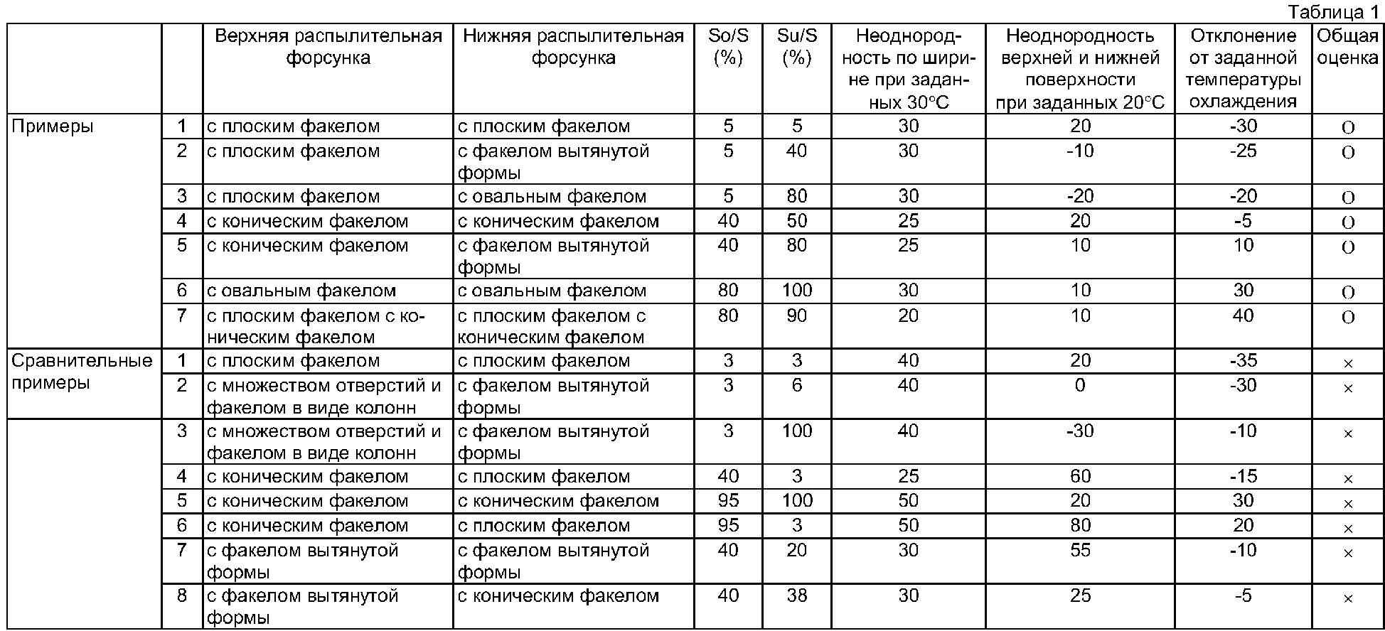 В этих 10 парах охлаждающих устройств листа типы распыляющих форсунок, размещенных в охлаждающем устройстве 4а верхней поверхности и в охлаждающем устройстве 4b нижней поверхности, технические характеристики форсунок, количество форсунок, условия расположения, условия соседства и отношения So/S, Su/S, и So/Su площади поверхностей падения водяных струй по отношению к площади поверхности листа 6 изменялись для осуществления эксперимента по охлаждению листа толстолистовой стали.