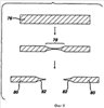 На фиг.9 полосовой материал 84 из нержавеющей стали прокатывается в середине для обеспечения скошенных поверхностей 86. Прокатанный полосовой материал затем смещается вдоль своей длины в областях 88 и уплощается для обеспечения ослабленных областей 90. Смещение и расплющивание описаны в заявке на патент США, которые включены предварительно посредством ссылки. После расплющивания полосовой материал включает в себя части 94 лезвия и удаляемые части 92 исходного материала для лезвий. Полосовой материал разделяется в середине по длине либо до, либо после термообработки, и после дальнейшей обработки, включающей в себя заострение отдельных скошенных поверхностей 86, преобразуется в исходные материалы бритвенных лезвий, включающих в себя части лезвия бритвы и удаляемые части. Исходные материалы лезвий бритвы, включающие в себя части лезвий и удаляемые части, описаны в заявке на патент США и в патенте США 6.629.475, которые также включены сюда посредством ссылки.