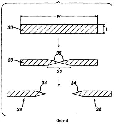 На фиг.4 листовой материал 30 из нержавеющей стали преобразуется в лезвия 32 бритвы с режущими кромками 34. Листовой материал 30 имеет толщину (t) между примерно 0,002 дюйма и примерно 0,006 дюйма (например, примерно 0,003 дюйма или примерно 0,004 дюйма) и ширину (w), достаточную для получения лезвий 32 бритвы.