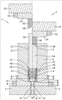 Верхний прессовочный стол 12, изначально находящийся в верхнем положении (на левой половине чертежа), затем снижается посредством стандартного прессовочного гидравлического механизма, передвигая штамп 10 по направлению к верхнему концу заготовки 14. Затем имеет место осадка, при этом штамп 10 оказывает под действием прессовочного стола 12 давление на заготовку 14, которая осаживается, так как она содержится в этом частном случае изначально на три четверти своей высоты в корпусе 3. Штамп 10 проходит вниз в ходе операции осадки со скоростью от 10 до 20 м/с. Осадка заготовки 14 выражается снижением ее длины и увеличением ее сечения.