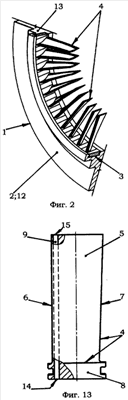 После установки лопаток 4 в обоймы 12 последние вновь собираются по продольной плоскости разъема 13, скрепляются, и получается законченное изделие – один из основных элементов осевого компрессора газовой турбины – его направляющий аппарат 1.