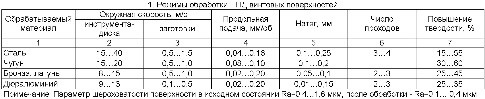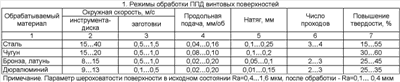 Режимы обработки винтовых поверхностей деформирующими элементами – роликами диаметром малой ступени 7 10 мм и радиусом сферической рабочей поверхности r=3,5 5 мм и давлении сжатого воздуха 0,63 МПа приведены в таблице.