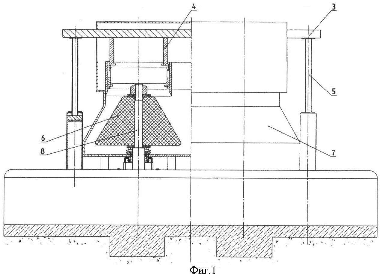 Для достижения указанного технического результата в установке для переработки изношенных автомобильных покрышек подающее устройство заменено на устройство подачи – траверсу, горизонтально расположенные с зазором режущие абразивные цилиндры заменены абразивным измельчителем, имеющим форму усеченного конуса, закрепленного на вертикально вращающемся валу привода, система жидкостного охлаждения и транспортирования исключена.