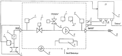Основное назначение вакуумной установки – создание и поддержание заданного разрежения в вакуумируемом приемном баке 1 вакуумного туалета транспортного средства. СУЖ 2 контролирует от переполнения приемного бака 1 от поступающей в него жидкости. Фильтр-сепаратор 3 очищает газо-воздушную смесь от влаги и механических примесей. Датчик давления 4 контролирует разрежение в вакуумной магистрали приемного бака 1. Электромагнитный клапан 5 открывает или перекрывает по сигналу БУ 17 вакуумируемую магистраль, а электромагнитный клапан 6 обеспечивает режим продувки чистым воздухом вакуумного насоса 10. Датчик температуры 7 контролирует вакуумный насос 10 и управляется БУ 17. Датчик температуры 9 контролирует температуру воздуха внутри установки и связан с блоком управления 17, и может включать и выключать элемент нагревательный 11 и вентилятор 12 с целью поддержания оптимальной температуры внутри установки вакуумной. Датчик давления 8 контролирует давление на выходе вакуумного насоса 10 для избежания выхода его из строя и одновременно контролирует степень загрязнения выходного фильтра 18, соединенного с атмосферой.