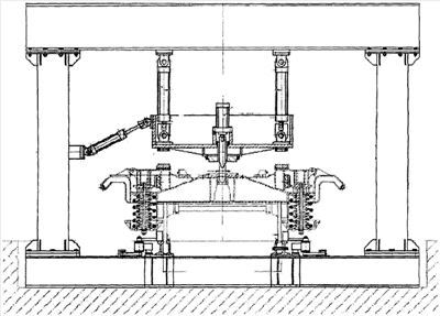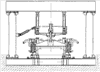 Основными частями системы является стенд с механизмами нагружения и подсистема определения положения элементов тележки. Отремонтированная тележка подкатывается под портал стенда и нагружается вертикальной нагрузкой, соответствующей нагрузке от кузова вагона. Предусмотрено также горизонтальное (продольное и поперечное) нагружение тележки. Стенд с механизмами нагружения автоматизированной системы контроля ходовых частей пассажирских вагонов показан на чертеже.
