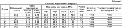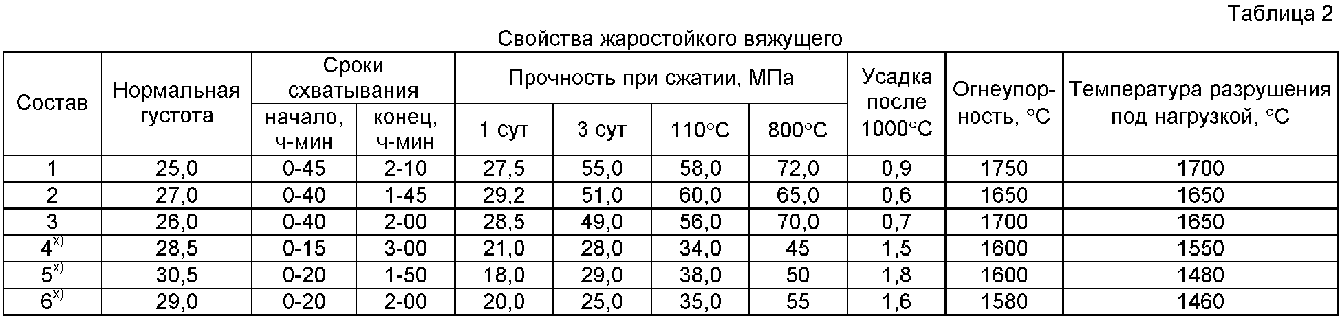 Температура плавления СаО·2Al2O3 – 1770°С, а шпинели и хромистого корунда выше 2000°С. За счет нового соотношения исходных компонентов и их качества получено жаростойкое вяжущее со следующими свойствами: Нормальная густота 25-27% Сроки схватывания, ч-мин: начало от 40 до 45 мин, конец от 1 ч 45 мин до 2 ч 10 мин