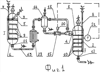 В варианте по Фиг.1 в схеме использован отдельный теплообменник 23, размещенный на трубопроводе передачи 13, перед промежуточным сборником 14.
