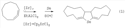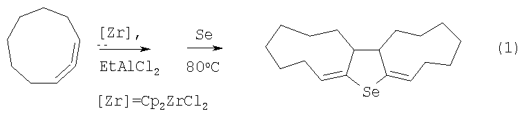 Указанное соединение может найти применение в тонком органическом синтезе, а также при получении гетероциклических соединений с биологической активностью. 4) с последующей внутримолекулярной циклизацией по схеме: Известный способ не позволяет синтезировать 1,2,3,4,5,6,10,11,12,13,14,15,15а,15b-тетрадекагидродициклонона[b,d] селенофен общей формулы (1). Известным способом не может быть получен 1,2,3,4,5,6,10,11,12,13,14,15,15а, 15b-тетрадекагидродициклонона[b,d]селенофен общей формулы (1). Предлагается новый способ синтеза 1,2,3,4,5,6,10,11,12,13,14,15,15а, 15b-тетрадекагидродициклонона[b,d]селенофена общей формулы (1). Сущность способа заключается во взаимодействии циклонона-1,2-диена с этилалюминийдихлоридом (EtAlCl2) в присутствии Mg (порошок) и катализатора цирконацендихлорида (Cp2ZrCl2), взятых в мольном соотношении циклонона-1,2-диен:EtAlCl2:Mg:Cp2ZrCl2=20:(11-13):20:(1.0-1.4), предпочтительно 20:12:20:1.2, в атмосфере аргона при комнатной температуре (20-22°С) и атмосферном давлении в течение 6-8 часов в тетрагидрофуране, с последующим добавлением эквимольного к EtAlCl2 количества селена (Se), бензола в качестве растворителя и нагреванием реакционной массы в течение 7 час при температуре -80°С. Получают 1,2,3,4,5,6,10,11,12,13,14,15,15а,15b-тетрадекагидродициклонона-[b,d]селенофен общей формулы (1) с выходом 40-56%. Реакция протекает по схеме: Целевой продукт (1) образуются только лишь с участием циклонона-1,2-диена, EtAlCl2, селена (Se), магния и катализатора Cp2ZrCl2. В присутствии других катализаторов на основе комплексов переходных металлов (например, Zr(acac)4, Cp2TiCl2, Ni(acac)2, Ni(acac)2, Fe(acac)3) целевой продукт (1) не образуется. Проведение реакции в присутствии катализатора Cp2ZrCl2 больше 14 мол.% по отношению к циклонона-1,2-диену не приводит к существенному увеличению выхода целевого продукта (1). Использование в реакции катализатора Cp2ZrCl2 менее 10 мол.% снижает выход трициклического селенофена (1), что связано со снижением каталитически активных центров в реакционной массе. Изменение соотношения исходных реагентов в сторону увеличения содержания EtAlCl2 или Se по отношению к циклонона-1,2-диену не приводит к значительному повышению выхода целевого продукта (1). Снижение количества EtAlCl2 или Se по отношению к циклонона-1,2-диену уменьшает выход трициклического селенофена (1). Существенные отличия предлагаемого способа: В предлагаемом способе используются в качестве исходных соединений циклонона-1,2-диен, EtAlCl2 и Se. В известном способе используется в качестве исходного реагента фенилаллилселенид. Предлагаемый способ обладает следующими преимуществами. Способ позволяет получать с высокой селективностью 1,2,3,4,5,6,10,11,12,13,14,15,15а,15b-тетрадекагидродициклонона, [b,d]селенофен общей формулы (1), синтез которого в литературе не описан. Способ поясняется следующими примерами. ПРИМЕР 1. В стеклянный реактор, установленный на магнитной мешалке, в атмосфере аргона помещают 1.2 ммоль Cp2ZrCl2, 20 ммоль циклонона-1,2-диена, 20 ммолей магния (порошок), 10 мл тетрагидрофурана и при температуре ~0°С 12 ммоль EtAlCl2. Перемешивают при комнатной температуре 7 час, затем добавляют 12 ммоль селена (Se), 10 мл бензола удаляют перегонкой тетрагидрофуран, выдерживают реакционную массу в течение 7 час при температуре ~80°С. Получают индивидуальный 1,2,3,4,5,6,10,11,12,13,14,15,15а,15b-тетрадекагидродициклонона[b,d]селенофен с выходом 51%. Спектральные характеристики 1,2,3,4,5,6,10,11,12,13,14,15,15а,15b-тетрадекагидродициклонона[b,d]селенофена (1).