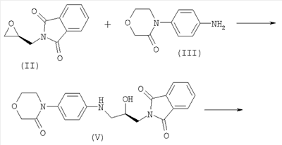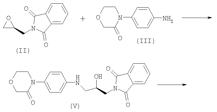 При 20°С смешивают 1173 г 2-[(2S)-2-оксиранилметил]-1Н-изоиндол-1,3-(2Н)-диона (II) и 4-(4-аминофенил)-3-морфолинона (III) с 6,7 л воды и 14,1 л этанола. Суспензию нагревают до 58-60°С и образующийся раствор продолжают перемешивать 36 часов. Через 2 часа реакционную смесь смешивают с 5 г кристаллического 2-((2R)-2-гидрокси-3-{[4-(3-оксо-4-морфолинил)фенил]амино}-пропил)-1Н-изоиндол-1,3(2Н)-диона (V), после чего начинается кристаллизация продукта. После охлаждения до 26°С выпавший продукт реакции отсасывают, промывают этанолом и затем сушат. Выход 1522 г (81,4% от теории). Т.пл. 215°С.