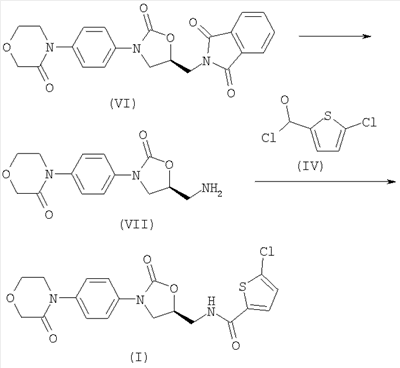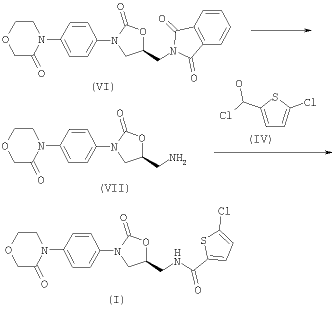 При этом взаимодействием 2-[(28)-2-оксиранилметил]-1Н-изоиндол-1,3-(2Н)-диона (II) с 4-(4-аминофенил)-3-мофолиноном (III) получают 2-((2R)-2-гидрокси-3-{[4-(3-оксо-4-морфолинил)фенил]амино} пропил)-1Н-изоиндол-1,3(2Н)-дион (V). Затем действием эквивалента фосгена превращают (V) в 2-({(5S)-2-оксо-3-[4-(3-оксо-4-морфолинил)фенил]-1,3-оксазолидин-5-ил}метил)-1Н-изоиндол-1,3(2Н)-дион (VI). Отщепление фталимидной защитной группы приводит к образованию 4-{4-[(5S)-5-(аминометил)-2-оксо-1,3-оксазолидин-3-ил]фенил}-морфолин-3-она (VII), взаимодействием которого в заключение с 5-хлор-тиофен-2-карбонилхлоридом (IV) получают 5-хлор-N-({(5S)-2-оксо-3-[4-(3-оксо-4-морфолинил)-фенил]-1,3-оксазолидин-5-ил}-метил)-2-тиофенкарбоксамид (I).