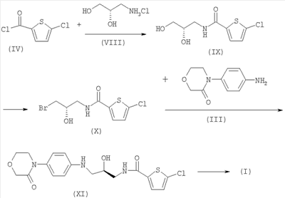 В патенте ФРГ 10300111.5 сообщается об альтернативном способе синтеза соединения формулы (I) исходя из 5-хлортиофен-2-карбонилхлорида (IV), гидрохлорида (2S)-3-аминопропан-1,2-диола (VIII) и 4-(4-аминофенил)-3-мофолинона (III):