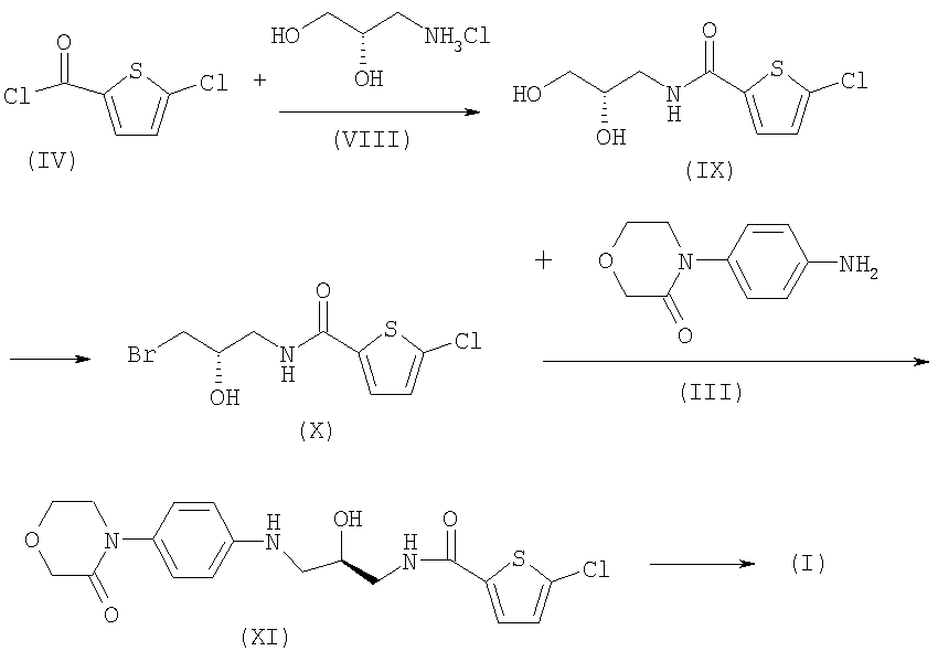 При этом 5-хлортиофен-2-карбонилхлорид (IV) реакцией с гидрохлоридом (2S)-3-аминопропан-1,2-диола (VIII) превращают в ((S)-2,3-дигидроксипропил)-амид 5-хлортиофен-2-карбоновой кислоты (IX). Затем (IX) превращают в ((S)-3-бром-2-гидроксипропил)-амид 5-хлортиофен-2-карбоновой кислоты (X), из которого далее взаимодействием с 4-(4-аминофенил)-3-морфолиноном (III) синтезируют {(R)-2-гидрокси-3-[4-(3-оксоморфолин-4-ил)-фениламино]-пропил}-амид 5-хлортиофен-2-карбоновой кислоты (XI). В заключение (XI) реакцией с фосгеном или эквивалентом фосгена превращают в 5-хлор-N-({(5S)-2-оксо-3-[4-(3-оксо-4-морфолинил)фенил]-1,3-оксазолидин-5-ил}-метил)-2-тиофен-карбоксамид (I).