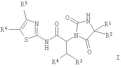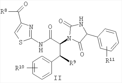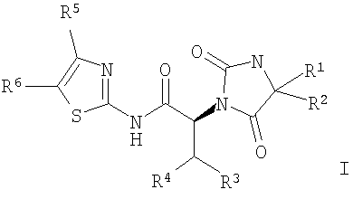 10. Соединение по п.1 или 9, выбранное из группы, включающей: (2S,3S)-N-(4-Ацетилтиазол-2-ил)-2-[(R)-4-(4-метоксифенил)-2,5-диоксоимидазолидин-1-ил]-3-фенилбутирамид; (2S,3S)-N-(4-Ацетилтиазол-2-ил)-2-[(R)-4-(4-гидроксифенил)-2,5-диоксоимидазолидин-1-ил]-3-фенилбутирамид; (2S,3S)-N-(4-Ацетилтиазол-2-ил)-2-{(R)-4-[4-(2-гидроксиэтокси)фенил]-2,5-диоксоимидазолидин-1-ил}-3-фенилбутирамид; (2S,3S)-N-(4-Ацетилтиазол-2-ил)-2-{(R)-4-[4-(2-метоксиэтокси)фенил]-2,5-диоксоимидазолидин-1-ил}-3-фенилбутирамид; (2S,3S)-N-(4-Ацетилтиазол-2-ил)-2-((R)-4-{4-[2-(2-метоксиэтокси)этокси]фенил}-2,5-диоксоимидазолидин-1-ил)-3-фенилбутирамид; (2S,3S)-N-(4-Ацетилтиазол-2-ил)-2-{(R)-4-[4-(2-этоксиэтокси)фенил]-2,5-диоксоимидазолидин-1-ил}-3-фенилбутирамид; (2S,3S)-N-(4-Ацетилтиазол-2-ил)-2-{(R)-4-[4-(2-диметиламиноэтокси)фенил]-2,5-диоксоимидазолидин-1-ил}-3-фенилбутирамид; соединение с трифторуксусной кислотой (2S,3S)-N-(4-Ацетилтиазол-2-ил)-2-{(R)-4-[4-(2-диэтиламиноэтокси)фенил]-2,5-диоксоимидазолидин-1-ил}-3-фенилбутирамид; соединение с трифторуксусной кислотой (2S,3S)-N-(4-Ацетилтиазол-2-ил)-2-[(R)-4-(4-этоксифенил)-2,5-диоксоимидазолидин-1-ил]-3-фенилбутирамид; (2S,3S)-N-(4-Ацетилтиазол-2-ил)-2-{(5)-4-[4-(2-диметиламиноэтокси)фенил]-2,5-диоксоимидазолидин-1-ил}-3-фенилбутирамид; соединение с трифторуксусной кислотой Диэтиловый эфир (4-{1-[(1S,2S)-1-(4-ацетилтиазол-2-илкарбамоил)-2-фенилпропил]-2,5-диоксоимидазолидин-4-ил}фенил)фосфоновой кислоты; (2S,3S)-N-(4-Ацетилтиазол-2-ил)-2-[4-(4-диметиламинофенил)-2,5-диоксоимидазолидин-1-ил]-3-фенилбутирамид; (4-Ацетилтиазол-2-ил)-амид (2S,3S)-2-[(R)-4-(4-метоксифенил)-2,5-диоксоимидазолидин-1-ил]-3-фенилпентановой кислоты; (2S,3S)-2-[(R)-4-(4-Метоксифенил)-2,5-диоксоимидазолидин-1-ил]-3-фенил-N-(4-пропионилтиазол-2-ил)бутирамид; (2S,3S)-2-[(R)-4-(2,3-Дигидробензо[1,4]диоксин-6-ил)-2,5-диоксоимидазолидин-1-ил]-3-фенил-M-(4-пропионилтиазол-2-ил)бутирамид; (2S,3S)-2-[(R)-4-(4-Этоксифенил)-2,5-диоксоимидазолидин-1-ил]-3-фенил-N-(4-пропионилтиазол-2-ил)бутирамид; (2S,3S)-2-[(R)-4-(4-Гидроксифенил)-2,5-диоксоимидазолидин-1-ил]-3-фенил-H-(4-пропионилтиазол-2-ил)бутирамид; (2S,3S)-2-{(R)-4-[4-(2-Метоксиэтокси)фенил]-2,5-диоксоимидазолидин-1-ил}-3-фенил-R-(4-пропионилтиазол-2-ил)бутирамид; (2S,3S)-2-{(S)-4-[4-(2-Метоксиэтокси)фенил]-2,5-диоксоимидазолидин-1-ил}-3-фенил-N-(4-пропионилтиазол-2-ил)бутирамид; (2S,3S)-2-{(R)-4-[4-(2-Гидроксиэтокси)фенил]-2,5-диоксоимидазолидин-1-ил}-3-фенил-N-(4-пропионилтиазол-2-ил)бутирамид; (2S,3S)-2-((R)-4-{4-[2-(2-Метоксиэтокси)этокси]фенил}-2,5-диоксоимидазолидин-1-ил)-3-фенил-N-(4-пропионилтиазол-2-ил)бутирамид и (2S,3S)-2-{(R)-4-[4-(2-Этоксиэтокси)фенил]-2,5-диоксоимидазолидин-1-ил}-3-фенил-N-(4-пропионилтиазол-2-ил)бутирамид.