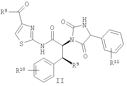 11. Соединение по п.1 или 9, выбранное из группы, включающей: (2S,3S)-2-{(R)-4-[4-(2-Этоксиэтокси)фенил]-2,5-диоксоимидазолидин-1-ил}-3-фенил-N-(4-пропионилтиазол-2-ил)бутирамид; (2S,3S)-2-{(R)-4-[4-(2-Диметиламиноэтокси)фенил]-2,5-диоксоимидазолидин-1-ил}-3-фенил-N-(4-пропионилтиазол-2-ил)бутирамид; соединение с трифторуксусной кислотой Диметиловый эфир (4-{(R)-2,5-диоксо-1-[(1S,2S)-2-фенил-1-(4-пропионилтиазол-2-илкарбамоил)пропил]имидазолидин-4-ил}феноксиметил)фосфоновой кислоты; (2S,3S)-N-(4-Изобутирилтиазол-2-ил)-2-{4-[4-(2-метоксиэтокси)фенил]-2,5-диоксоимидазолидин-1-ил}-3-фенилбутирамид; (2S,3S)-N-(4-Изобутирилтиазол-2-ил)-2-[(R)-4-(4-метоксифенил)-2,5-диоксоимидазолидин-1-ил]-3-фенилбутирамид; (2S,3S)-2-{(3)-4-[4-(2-Диметиламиноэтокси)фенил]-2,5-диоксоимидазолидин-1-ил}-3-фенил-N-(4-пропионилтиазол-2-ил)бутирамид; соединение с трифторуксусной кислотой; (2S,3S)-2-{2,5-Диоксо-4-[4-(2-пиперидин-1-илэтокси)фенил]имидазолидин-1-ил}-3-фенил-N-(4-пропионилтиазол-2-ил)бутирамид; (2S,3S)-2-{4-[4-(2-Морфолин-4-илэтокси)фенил]-2,5-диоксоимидазолидин-1-ил}-3-фенил-N-(4-пропионилтиазол-2-ил)бутирамид; (2S,3S)-3-(3-Фторфенил)-2-{(R)-4-[4-(2-метоксиэтокси)фенил]-2,5-диоксоимидазолидин-1-ил}-N-(4-пропионилтиазол-2-ил)бутирамид; (2S,3S)-2-[(R)-4-(4-Метокси-3-метилфенил)-2,5-диоксоимидазолидин-1-ил]-3-фенил-N-(4-пропионилтиазол-2-ил)бутирамид; (2S,3S)-2-{(S)-4-[4-(2-Гидроксиэтокси)фенил]-2,5-диоксоимидазолидин-1-ил}-3-фенил-N-(4-пропионилтиазол-2-ил)бутирамид; (2S,3S)-2-((R)-2,5-Диоксо-4-фенилимидазолидин-1-ил)-3-фенил-N-(4-пропионилтиазол-2-ил)бутирамид; (2S,3S)-2-[4-(4-Диметиламинофенил)-2,5-диоксоимидазолидин-1-ил]-3-фенил-N-(4-пропионилтиазол-2-ил)бутирамид; (2S,3S)-2-[4-(4-Морфолин-4-илфенил)-2,5-диоксоимидазолидин-1-ил]-3-фенил-N-(4-пропионилтиазол-2-ил)бутирамид; (2S,3S)-2-{4-[4-(4-Гидроксипиперидин-1-ил)фенил]-2,5-диоксоимидазолидин-1-ил}-3-фенил-N-(4-пропионилтиазол-2-ил)бутирамид; (2S,3S)-2-(4-{4-[(2-Метоксиэтил)метиламино]фенил}-2,5-диоксоимидазолидин-1-ил)-3-фенил-N-(4-пропионилтиазол-2-ил)бутирамид; (2S,3S)-N-(4-Циклопропанкарбонилтиазол-2-ил)-2-{(R)-4-[4-(2-метоксиэтокси)фенил]-2,5-диоксоимидазолидин-1-ил}-3-фенилбутирамид; (4-Пропионилтиазол-2-ил)амид (2S,3S)-2-{4-[4-(2-метоксиэтокси)фенил]-2,5-диоксоимидазолидин-1-ил}-3-метилпентановой кислоты; (2S,3R)-3-Бензилокси-2-{(R)-4-[4-(2-метоксиэтокси)-фенил]-2,5-диоксоимидазолидин-1-ил}-N-(4-пропионилтиазол-2-ил)-бутирамид; (2S,3S)-N-[4-(2-Метоксиацетил)тиазол-2-ил]-2-[(R)-4-(4-метоксифенил)-2,5-диоксоимидазолидин-1-ил]-3-фенилбутирамид; Метиловый эфир 2-{(2S,3S)-2-[(R)-4-(2,3-дигидробензо[1,4]диоксин-6-ил)-2,5-диоксоимидазолидин-1-ил]-3-фенилбутириламино}тиазол-4-карбоновой кислоты и Метиловый эфир 2-[(2S,3S)-2-((R)-2,5-диоксо-4-фенилимидазолидин-1-ил)-3-фенилбутириламино]тиазол-4-карбоновой кислоты.