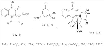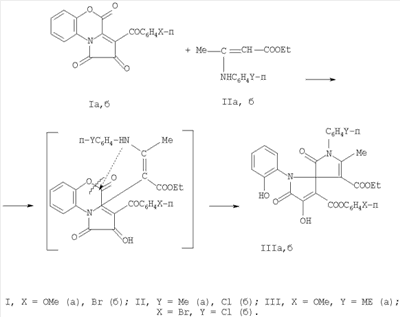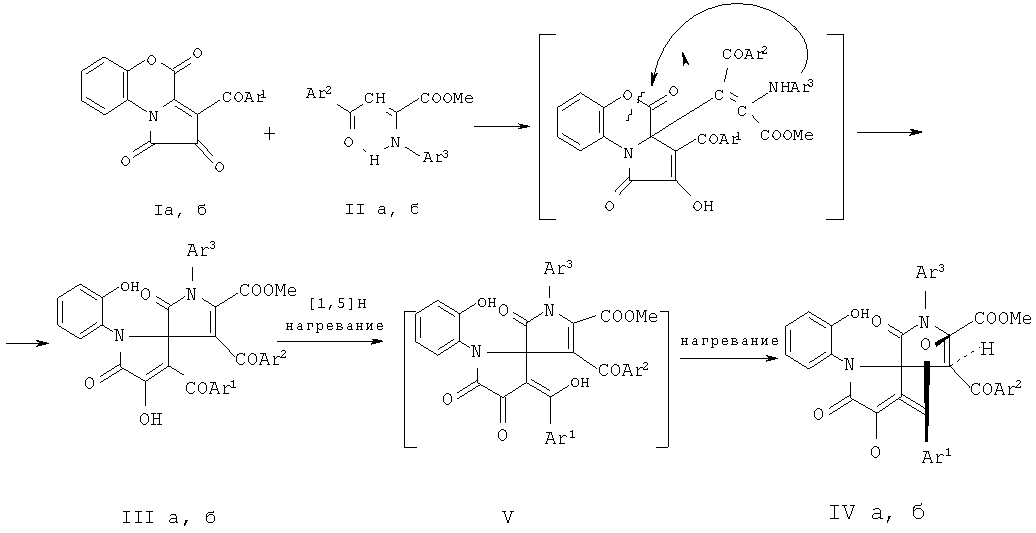 Поставленная задача осуществляется путем кипячения 3-ароил-2,4-дигидро-1Н-пирроло[2,1-с][1,4]бензоксазин-1,2,4-трионов с метил 4-арил-2-ариламино-4-оксо-2-бутеноатами, взятыми в соотношении 1:1, в инертном апротонном растворителе с получением промежуточных продуктов – замещенных метил