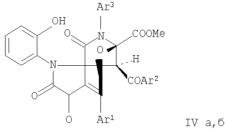 Ar1=Ar2=Ph, Ar3=C6H4Me-п (IIIa); и Ar1=C6H4Br-п, Аr2=С6H4ОЕt-п, Ar3=C6H4Me-п (IIIб), для получения метил 6,9-диарил-11-ароил-2-(о-гидpoкcифeнил)-3,4,10-тpиoкco-7-oкca-2,9-диaзaтpициклo[6.2.1.01,5]ундeц-6-ен-8-карбоксилатов формулы IV