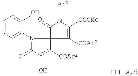 где Аr1 и Аr2 означает Ph, Ar3 означает С6Н4Ме-п (IVa); Ar означает С6Н4Br-п, Ar2 означает С6Н4OЕt-п, Ar3 означает С6Н4Ме-п (IVб), отличающийся тем, что метил 7-арил-4,9-диароил-3-гидрокси-1-(2-гидроксифенил)-2,6-диоксо-1,7-диазаспиро [4.4] нона-3,8-диен-8 карбоксилаты формулы III а, б: