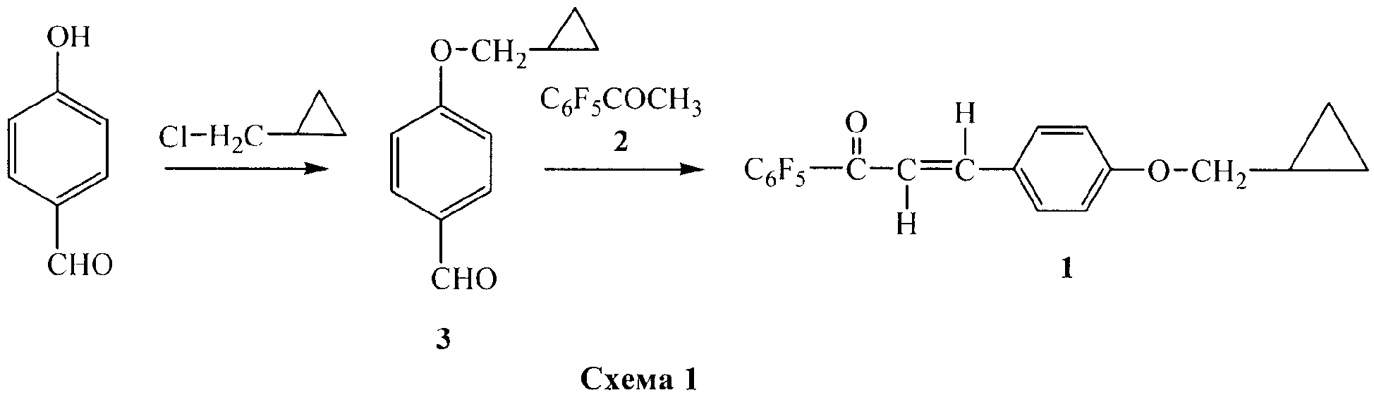 3-(4-Оксиран-2-илметокси)фенил-1-(перфторфенил)проп-2-ен-1-он (1) представляет собой эпоксипроизводное диарилпроп-2-ен-1-онов (халконов). Для получения халконов обычно используют конденсацию Кляйзена-Шмидта – взаимодействие ацетофенонов с ароматическими альдегидами в присутствии щелочи. С целью создания дополнительного реакционного центра – пентафторфенильного кольца с нуклеофильно подвижными атомами фтора – мы использовали в качестве карбонильной компоненты пентафторацетофенон (2). Для введения эпоксидной группы нами был синтезирован 4-(оксиран-2-илметокси)бензальдегид (3) из 4-гидроксибензальдегида и эпихлоргидрина и введен в конденсацию с пентафторацетофеноном (2) (схема 1).