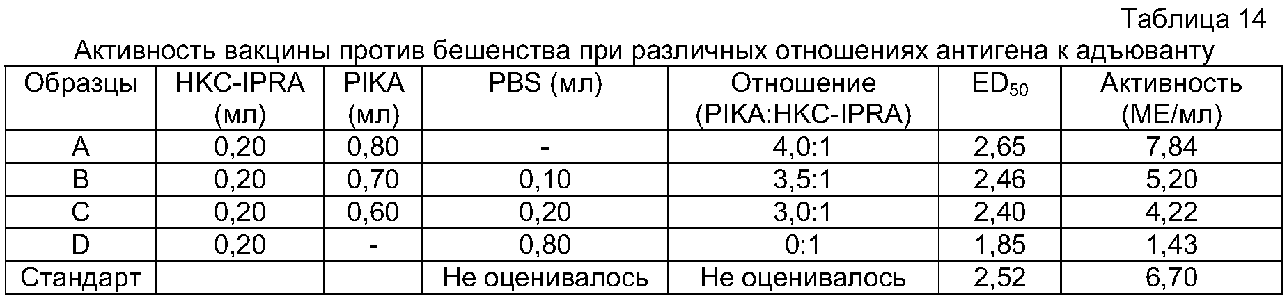 Различные количества антигена смешивали с различными количествами адъюванта с PBS, добавленным для обеспечения согласованного общего объема. Активность полученных вакцин определяли, используя тест активности NIH. Данные представлены в таблице 14.