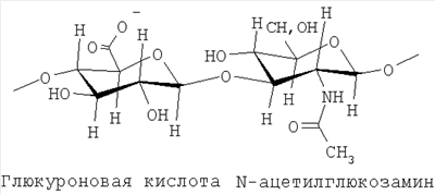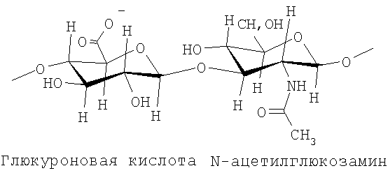 Гиалуроновая кислота является природным мукополисахаридом, состоящим из чередующихся звеньев D-глюкуроновой кислоты и N-ацетилглюкозамина, как показано в общем виде на нижеприведенной схеме: