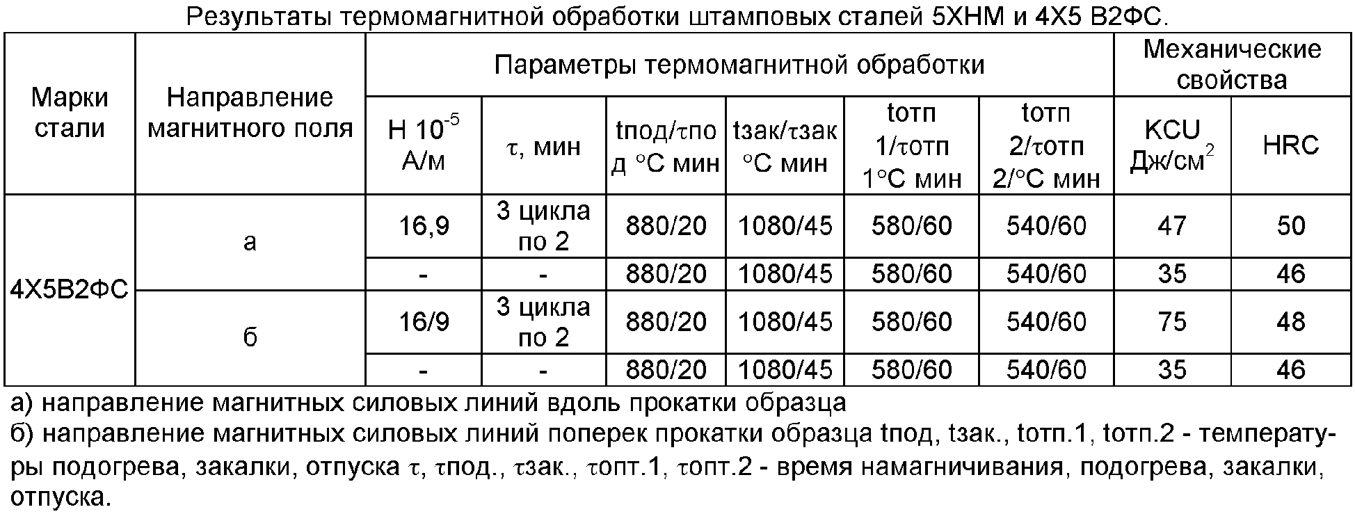 Изобретение относится к металлургии, в частности к термической обработке сталей и сплавов, и может быть использовано в машиностроении для повышения надежности штампов из сложнолегированных сталей при термической обработке в присутствии внешнего магнитного поля. Для повышения эксплуатационных характеристик изделий изделие из легированной штамповой стали подвергают магнитной обработке в постоянном магнитном поле с напряженностью не менее 16,9×105 А/м при температуре 20°С с количеством циклов не менее трех и с выдержкой в каждом цикле 2 мин, а затем термической обработке, при этом изделия ориентируют поперек или вдоль магнитного поля. 1 з.п. ф-лы, 1 табл.