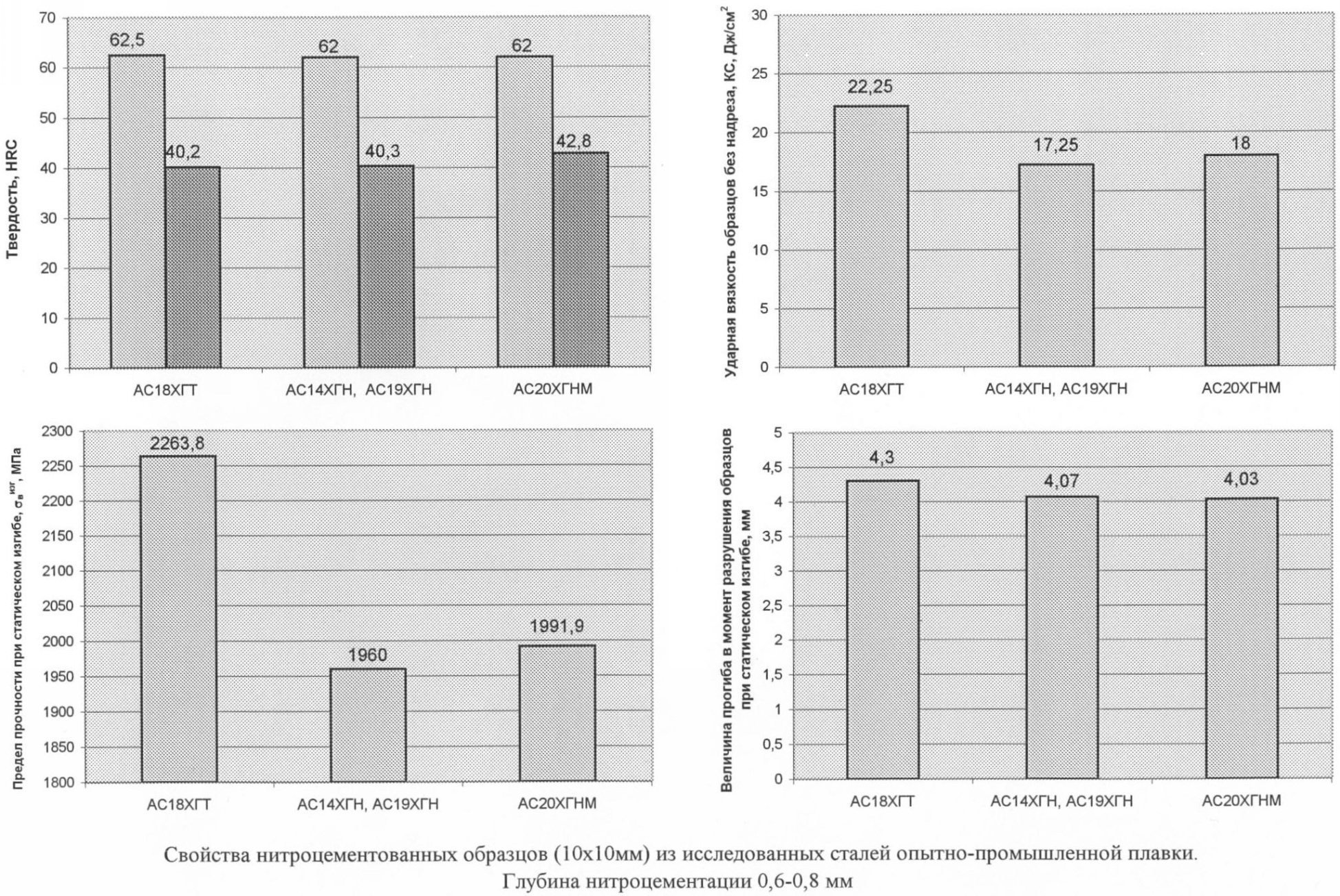 Результаты механических испытаний опытно-промышленных плавок стали предлагаемого состава (нитроцементированные образцы 10×10 мм, глубина нитроцементации 0,6-0,8 мм) приведены на фиг.1.
