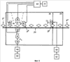На фиг.1 и фиг.2 представлена структурная схема устройства, реализующего разработанный непрерывный способ крашения ПМ. Устройство содержит компьютер (1); резервуар для красителя (2) с соответствующим выходным трубопроводом (3); резервуар (4) для вспомогательного вещества с соответствующим выходным трубопроводом (5); резервуар (6) для УЗК активирования воды в диапазоне частот 104-106 Гц с соответствующим выходным трубопроводом (7); резервуар (8) для УЗК активирования субстрата в диапазоне частот 104-106 Гц; субстрат (9):(90) – до воздействия УЗК, (91) – после воздействия УЗК, но до крашения, (92) – после крашения, (93) – после УЗК фиксации и предварительной УЗК сушки в диапазоне частот 104-106 Гц, (94) – после окончательной сушки; емкость (10) для приготовления КС и его активирования (малый гидроциклон) с первым УЗК гидроакустическим излучателем (11), с первым излучателем (12) электромагнитных волн, с первым устройством (13) для интенсивного механического перемешивания КС и с первым устройством (14) для создания избыточного статического давления 0,5-1,0 атм в емкости (10); емкость (15) для крашения ОС с помощью спрей-аппарата (16), первым воздушным УЗК излучателем (17), находящимся сзади спрей-аппарата; со вторым (18), третьим (19), четвертым (20) и пятым (21) воздушными УЗК излучателями, расположенными соответственно сверху, снизу, слева и справа от ОС, движущегося по транспортеру (22), шестой воздушный УЗК излучатель (23), расположенный на входе устройства (24) для окончательного сушения ОС; водовод (25) для сточной воды; емкость (26) для очистки сточных вод от ВВ и КЧ – большой гидроциклон со вторым УЗК гидроакустическим излучателем (27), со вторым излучателем (28) электромагнитных волн, со вторым устройством (29) для интенсивного механического перемешивания очищаемой воды и со вторым устройством (30) для создания избыточного статического давления 2,5-5,0 атм, а также водовод (31) для очищенной воды, соединенный с резервуаром (6) для УЗК активирования воды.