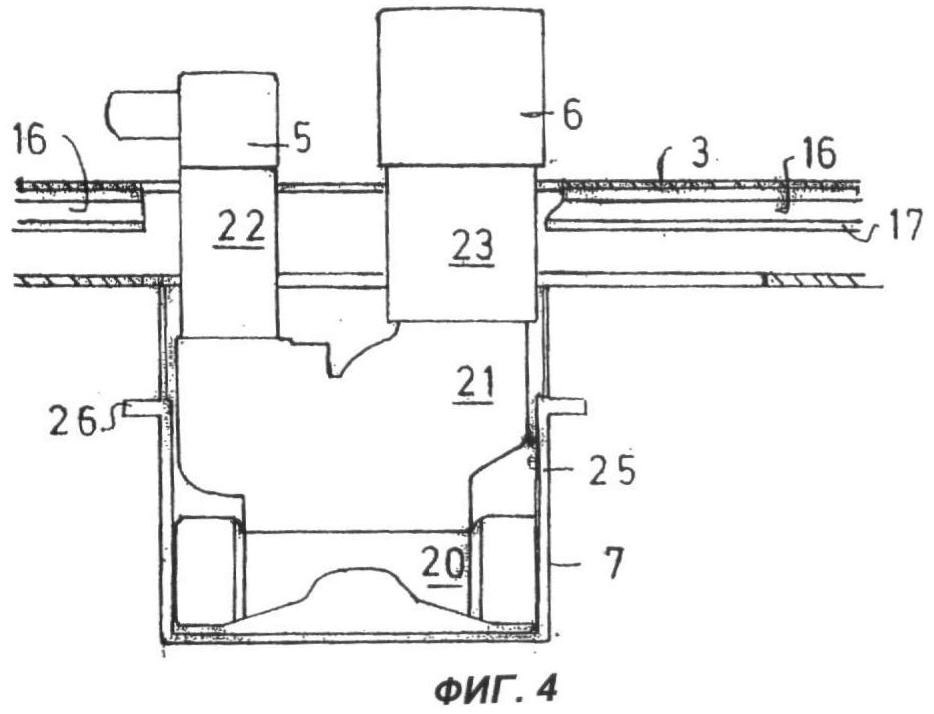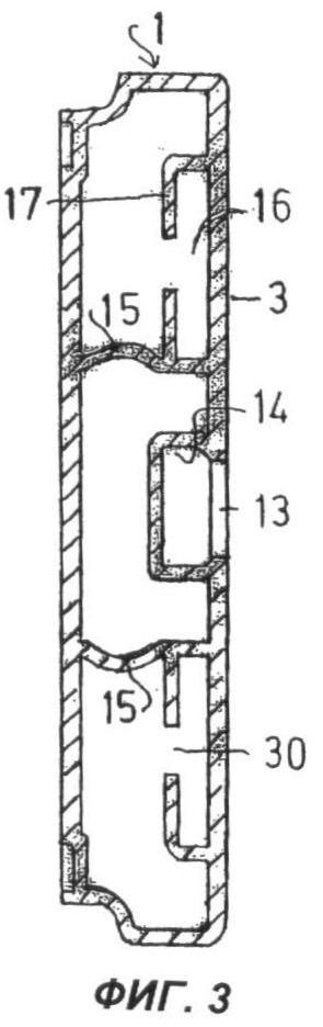 На задней поверхности передней стенки 3 внутри двух отделений образованы дополнительные плоские каналы 16, которые ограничены параллельной стенкой 17 с прорезью. Каналы 16 предназначены для размещения боковых душевых головок и описываются в дальнейшем.