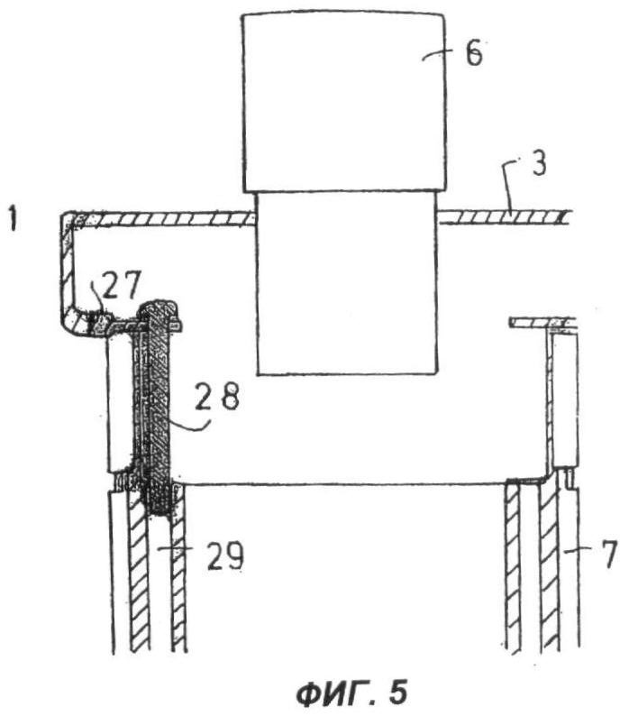 На фиг.5 представлен разрез в направлении, перпендикулярном направлению по фиг.4. Видно, что задняя стенка 2 профиля вырезана. На боковом участке 27 задней стенки 2 профиль 1 прикреплен к скрытой коробке 7. Для этой цели использован винт 28, который пропущен через отверстие в задней стенке 2 и завинчен в гнездо 29 скрытой коробки 7. Гнездо 29, представляющее собой относительно длинное отверстие, может иметь резьбу. Однако, также возможно, чтобы винт 28 сам нарезал резьбу. Таким образом, профиль может быть установлен на скрытой коробке 7, которая в свою очередь закреплена в стене. Кроме того, коробка может быть зафиксирована между корпусом 21 штуцера и профилем 1.