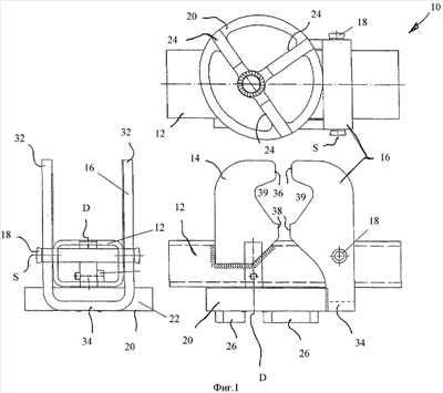 Поворотная зажимная колодка 16 имеет П-образную форму с двумя боковыми частями 32 и соединяющей их поперечной частью 34. В показанных на фиг.1 проекциях хорошо видно, что поперечная часть 34 поворотной зажимной колодки расположена под опорной трубой 12, а обе боковые части 32 поворотной зажимной колодки проходят параллельно друг другу слева, соответственно справа от опорной трубы 12 вверх и с противоположной стороны выступают за ее пределы. Другая зажимная колодка 16 состоит из двух идентичных частей, которые неподвижно закреплены на опорной трубе 12 с ее левой и правой сторон, например приварены к ней.