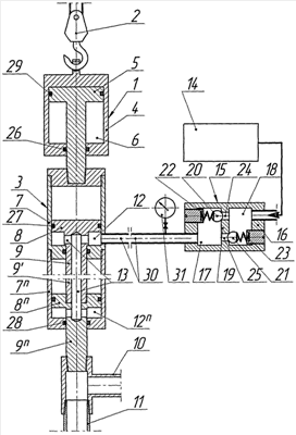 В результате поршни 8 8n со штоками 9; 9′ 9n под действием гидравлического давления, создаваемого насосом 14 в подпоршневых полостях 12 12n гидроцилиндров 7 7n, перемещаются вверх, вытягивая за собой прихваченную колонну труб 11 относительно перемещающихся вниз силовых цилиндров 7 7n генератора вертикальных импульсов 3, при этом во внутренней полости 6 демпфера 1 происходит сжатие газа поршнем 5, герметично вставленным в цилиндр 4, и происходит гашение ударного усилия, направленного вниз, воспринимаемого подъемником 2.