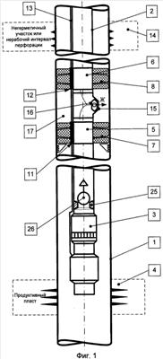 Также для эффективности и надежности способа по варианту 1 и 2 могут быть выполнены в зависимости от условий эксплуатации дополнительные операции, в частности герметичность колонны труб 2 определяют во время посадки или перед посадкой пакера 5 или пакеров 5 и 6. То есть на колонне труб 2 выше пакера 5 (см. фиг.4) или 6 (см. фиг.2) спускают ниппель 23 для установки в него с помощью канатной техники съемного обратного клапана при проверке колонны труб 2 на герметичность или исключения обратного перетока жидкости. Между пакерами 5 и 6 в скважинной камере (перепускной элемент) 15 может быть установлен с помощью канатной техники, съемный элемент 16 (см. фиг.1, 3) в виде глухой пробки, газлифтного или обратного клапана для проверки колонны труб 2 на герметичность как перед посадкой пакеров 5 и 6, так и после их посадки, а также во время эксплуатации скважины 1. Ниже пакера 5 или пакеров 5, 6 над насосной установкой 3 может быть установлен несъемный обратный клапан 24 (см. фиг.3) или ниппель 25 без или со съемным обратным клапаном 26 (см. фиг.1, 2) для возможности проверки колонны труб 2 на герметичность и/или исключения обратного перетока жидкости после остановки насосной установки 3. Также после запуска насосной установки 3 и вывода скважины 1 на режим может быть извлечен с помощью канатной техники, съемный обратный клапан 26 из его ниппель 25, например, для возможности создания обратного перетока или циркуляции жидкости через насос 3 (например, для промывки насоса 3, обработки призабойный зоны продуктивного пласта 4 и пр.). Кроме того, между пакерами 5 и 6 в скважинную камеру 15 может быть установлен с помощью канатной техники съемный элемент 16 в виде автономного манометра, для возможности измерения затрубного и/или трубного давления до посадки, во время посадки и после посадки пакеров 5 и 6, а также при работе насосной установки 3. После посадки пакеров 5, 6 и их опрессовки может быть установлен с помощью канатной техники в скважинную камеру 15 съемный элемент 16 в виде глухой пробки, газлифтного или обратного клапана, для повышения надежности и герметичности пакеров 5, 6 при эксплуатации скважины 1. На колонне труб 2 может быть спущен дополнительный пакер 27 (например, см. фиг.5, 6) и размещен над негерметичным участком или нерабочим интервалом перфорации 14 ствола скважины 1.