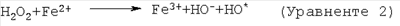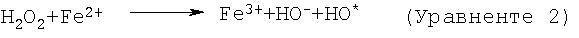 В реакции Фентона участвует перекись водорода и катализатор в виде двухвалентного железа (Уравнение 2). Перекись разлагается на ион гидроксида и свободный радикал гидроксила. Свободный радикал гидроксила является основным окисляющим веществом и может быть использован для окисления и разрушения органических молекул.