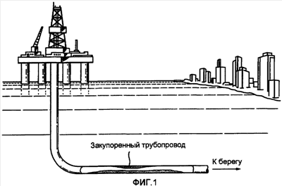 фиг.1 является упрощенной схемой морской платформы для добычи нефти, имеющей трубопровод к берегу, частично заблокированный парафиновыми отложениями;