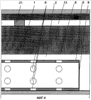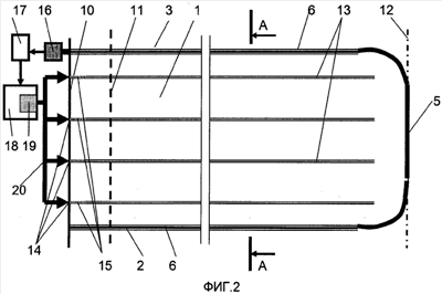 На чертежах показаны угольный пласт 1 горизонтальные участки дутьевой 2 и отводящий 3, участок сбойки 4 скважин 2 и 3 (в процессе газификации – газогенератор 5), трубопроводы 6, их концы 7, перфорация 8 стенок трубопроводов 6, стенки 9 скважин 2 и 3, борт 10 карьера, охранный целик 11, проектная граница 12 участка, предназначенного для газификации, разуплотняющие скважины 13, их устья 14 герметизаторов 15.