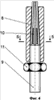Монтаж канатного анкера осуществляют следующим образом. Вслед за подвиганием забоя производят бурение скважин 1 по схеме согласно паспорту крепления горной выработки. Далее, канатный анкер в сборе вводят в скважину 1 на необходимую глубину, оставляя снаружи резьбовой стержень 9 хвостовика канатного анкера. Выпадение конструкции из вертикальных потолочных скважин предотвращает подпорный элемент 5, работающий как репер. Далее, на резьбовой стержень 9 хвостовика канатного анкера надевают, например, стандартную решетчатую затяжку и опорные элементы (на чертеже не показаны), производят предварительное натяжение канатного анкера, накручивая опорную гайку 11 на резьбовой стержень 9 хвостовика канатного анкера. При накручивании опорной гайки 11 происходит смещение конструкции канатного анкера в направлении к устью скважины с одновременным заклиниванием опорной головки 2 и каната 3 во втулке 4 из сыпучего материала, например кварцевого песка с крупностью зерен до 2 мм, поровое пространство которого заполнено связующим (например, эластичным, в виде материалов на основе каучука или высокомолекулярных соединений полимеров, технических силиконов). Скоба 6, изготовленная из упругой проволоки и вставленная между проволоками каната 3, сдвигается вместе с канатным анкером при его нагружении и выходит из зацепления с подпорным элементом 5, освобождая его из сжатого состояния, тем самым обеспечивая его полное заклинивание. При продолжении нагружения канатного анкера втулка 4 из сыпучего материала смещается к устью скважины 1 и опирается на подпорный элемент 5, который предотвращает ее дальнейшее смещение, там самым активизируя процесс заклинивания опорной головки 2 и каната 3 во втулке 4 из сыпучего материала за счет сил трения и сцепления. При достижении величины предварительного натяжения канатного анкера, оговоренной паспортом крепления горной выработки, накручивание гайки 11 на резьбовой стержень 9 прекращают. Далее производят инъекционное закрепление канатного анкера по известной технологии (по аналогии с технологией, описанной в прототипе или, например, литературе: Хямяляйнен В.А., Бурков Ю.В., Сыркин П.С. Формирование цементационных завес вокруг капитальных горных выработок. – М.: Недра, 1994. – 400 с: ил.), нагнетая по нагнетательной трубке, введенной через уплотнительную манжету между конструкцией канатного анкера и стенкой скважины 1 (на чертеже не показаны), связующий состав, например цементационный раствор, в кольцевое пространство между стенкой скважины 1 и канатом 3. При схватывании связующего состава канатный анкер полностью включается в общую работу системы крепления, формируемой из напряженно-армированной упрочненной приконтурной зоны горной выработки.