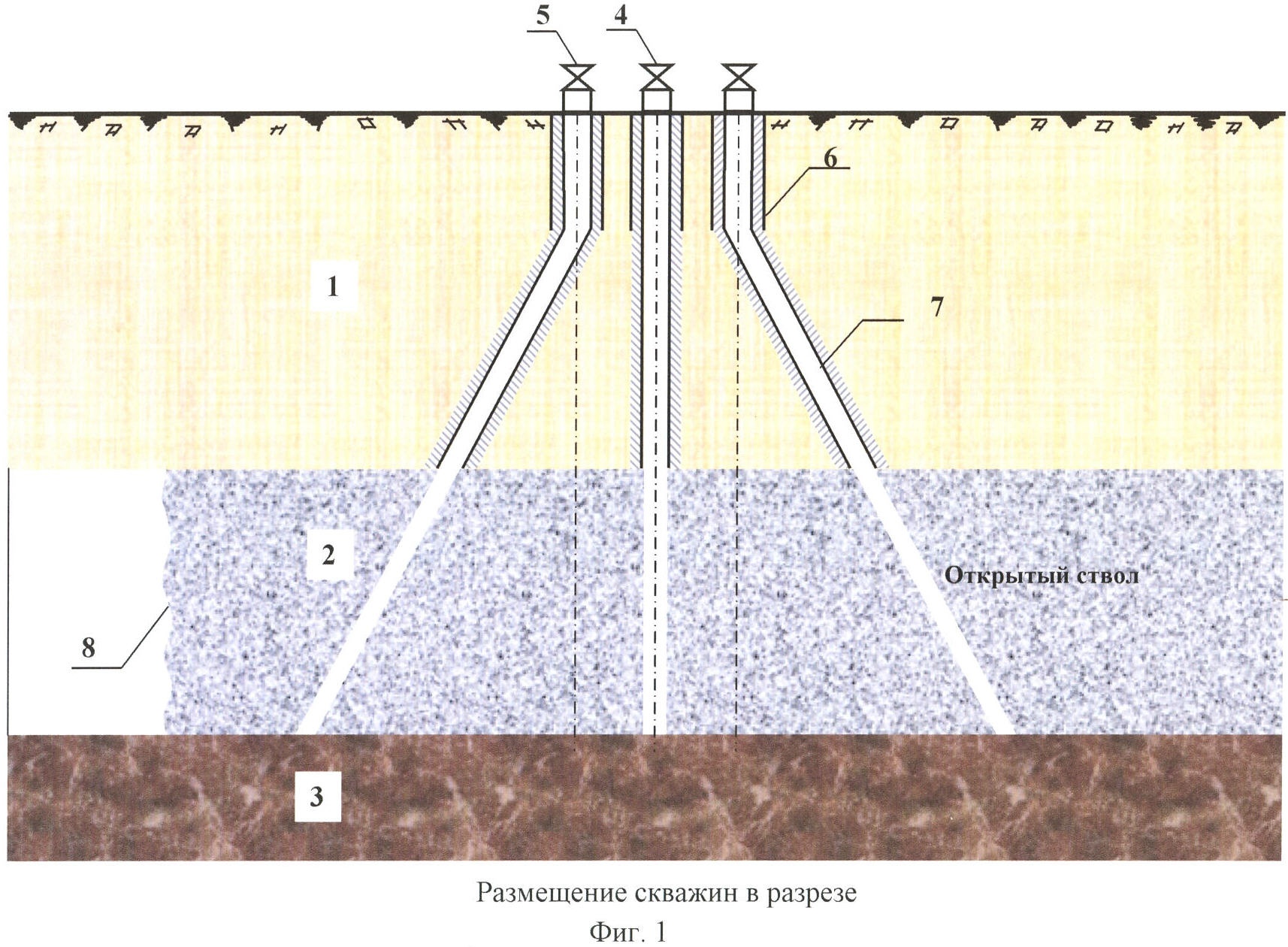 Таким образом, формируем куст скважин, включающий: 2 наклонные скважины в направлении забоя шахты (на расстоянии от забоя не менее 16 м), две вертикальные скважины и 2 наклонные скважины в направлении от забоя шахты. После подрыва зарядов в этих скважинах дегазация угольного пласта будет осуществлена на расстоянии от забоя шахты, равном 16 м+30 м+30 м+16 м=86 м.