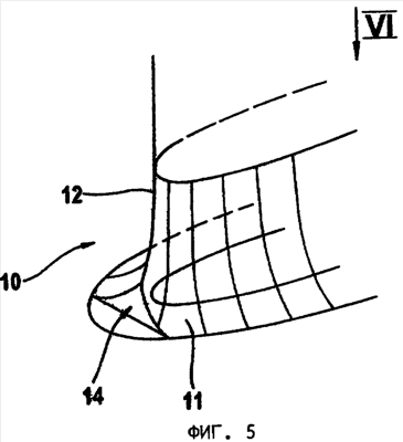 Следует отметить, что показанное на фиг.1-4 утолщение 11 представляет собой лишь один из возможных вариантов выполнения минимизирующих вторичные потоки утолщений. В других вариантах минимизирующие вторичные потоки утолщения могут быть образованы за счет увеличения таких параметров профиля пера лопатки, как радиус закругления передней кромки лопатки и/или угол раствора передней кромки лопатки, и/или угол раствора задней кромки лопатки, и/или абсолютная толщина профиля лопатки. Более подробную информацию о подобных утолщениях можно найти в публикации ЕР 0798447 В1, которая включена в настоящее описание в качестве ссылки.