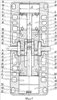 На Фиг.1 – продольный разрез двигателя при нахождении дальних поршней в крайнем верхнем положении, а ближних поршней – в крайнем нижнем.