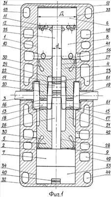 При сжатии скорость осевого вращения заряда в камере 8 замедляется из-за внутреннего трения и трения о стенки рабочей камеры 8. Начинается заполнение сопловых камер 29, 30 чистым воздухом из прилегающих к поршням 4, 6 слоев воздуха, а продолжается и заканчивается топливовоздушной смесью среднего слоя. Замедлению осевого вращения заряда, особенно в конце такта сжатия способствует наличие радиальных ребер 59 в сегментной канавке 55 на торце дальнего поршня 6, повышается стабильность зажигания.