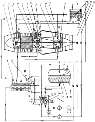 На чертеже изображена принципиальная схема масляной системы авиационного ГТД.