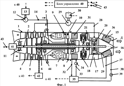 Авиационный двигатель оборудован блоком управления 40 и датчиками частоты вращения внутреннего и внешнего валов 41 и 42 соответственно. С блоком управления 40 электрическими связями 43 соединены датчики частоты вращения 41 и 42 и приводы 13 и 30.